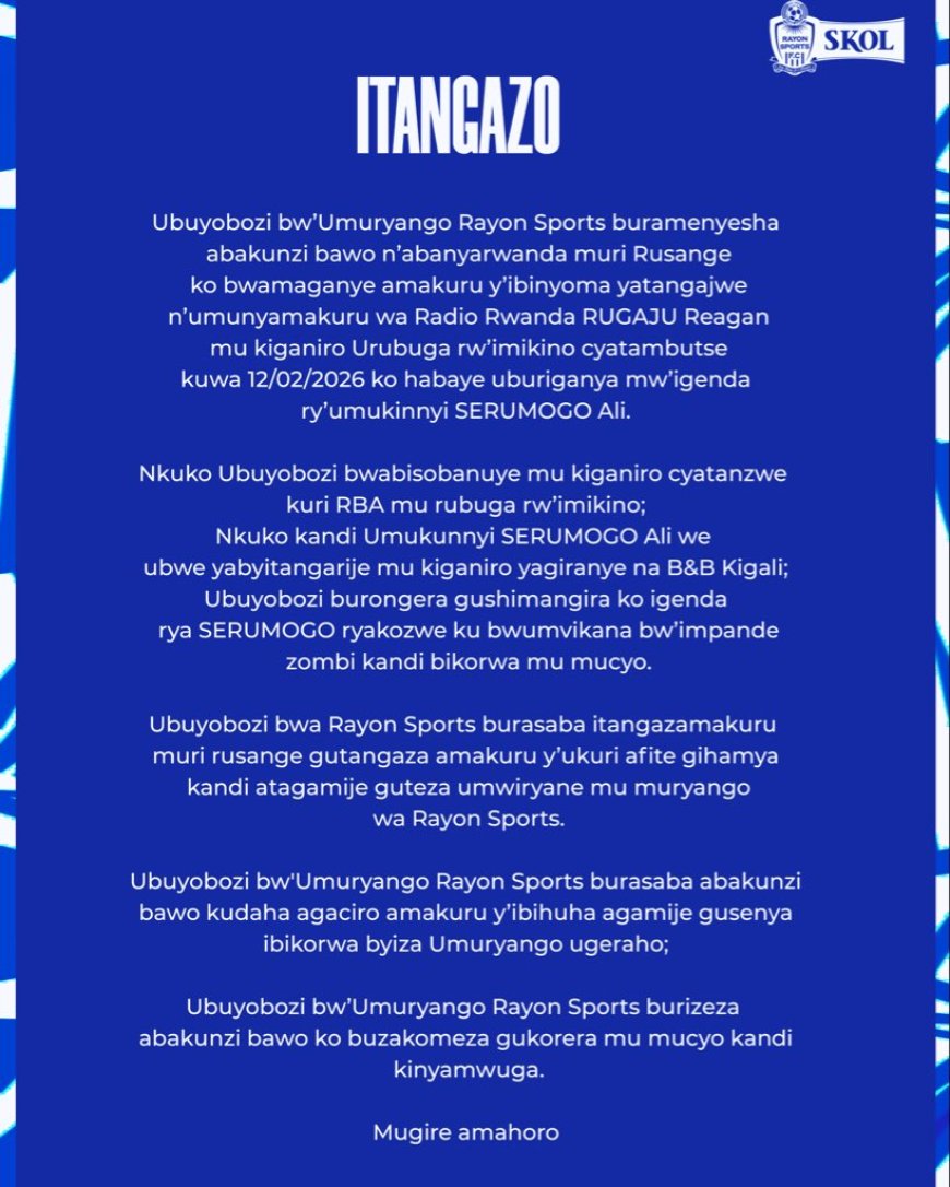 Kuri uyu wa Gatanu tariki 13 Gashyantare 2026, nibwo Rayon Sports yabishyizeho umucyo ku mugaragaro babinyujije ku mbuga nkoranyambaga z’ikipe, batangaza ko ibyo Rugaju Reagan yatangaje ari ibinyoma ahubwo ikipe ya Rayon Sports ijya gutandukana na Serumogo Ali, bumvikanye agendera Ubuntu.