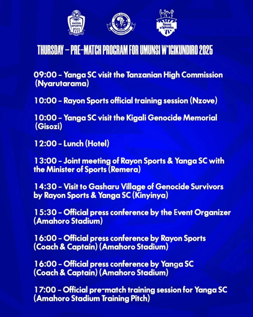 Rayon Sports kandi yashyize hanze gahunda iraza kugenderaho uyu munsi. Muri iyi gahunda harimo ko Yanga Africans iraza gusura urwibutso rwa Jenoside yakorewe Abatutsi mu 1994 ruherereye ku Gisozi.