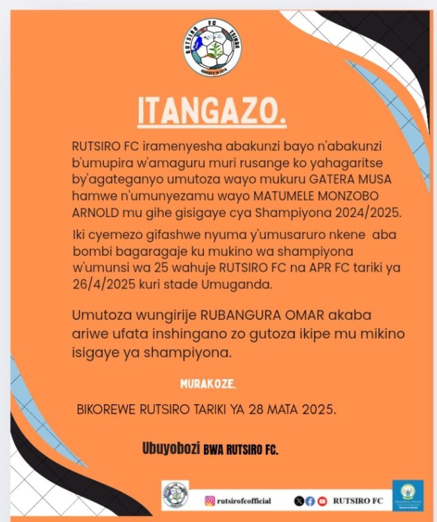 Mu itangazo ikipe ya Rutsiro FC yashyize ahagaragara yanavuze ko umuzamu witwa Matumele Monzobo Arnold nawe yahagaritswe. Rubangura Omar niwe ugiye gusigarana Rutsiro FC.