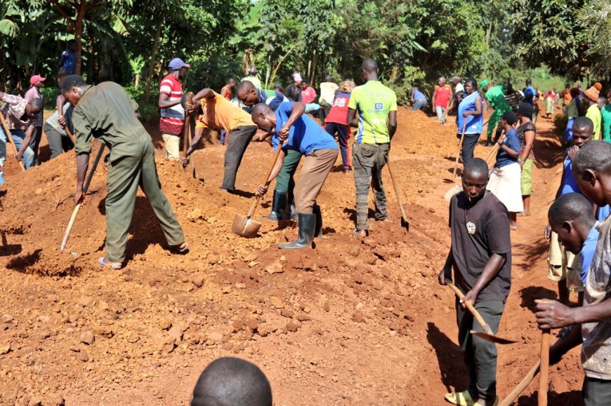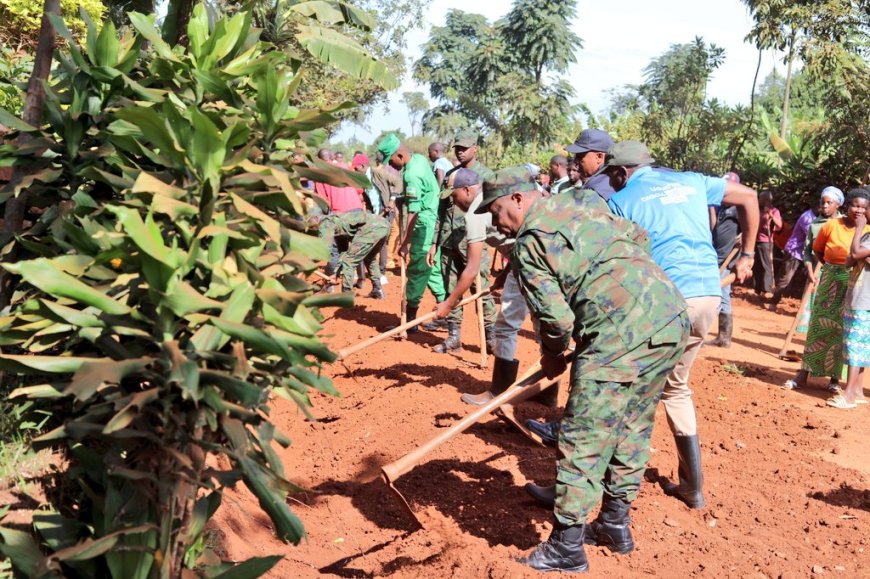 Umuyobozi w'Akarere Mbonyumuvunyi Radjab, Umuyobozi wa Police mu Ntara n'abandi bayobozi b'inzego z'umutekano bifatanyije n'abaturage b'Umurenge wa Nyakariro mu Umuganda rusange, batunganya umuhanda uhuza utugari twa Bihembe, Munini na Gishore ureshya n'ibirometero 5.