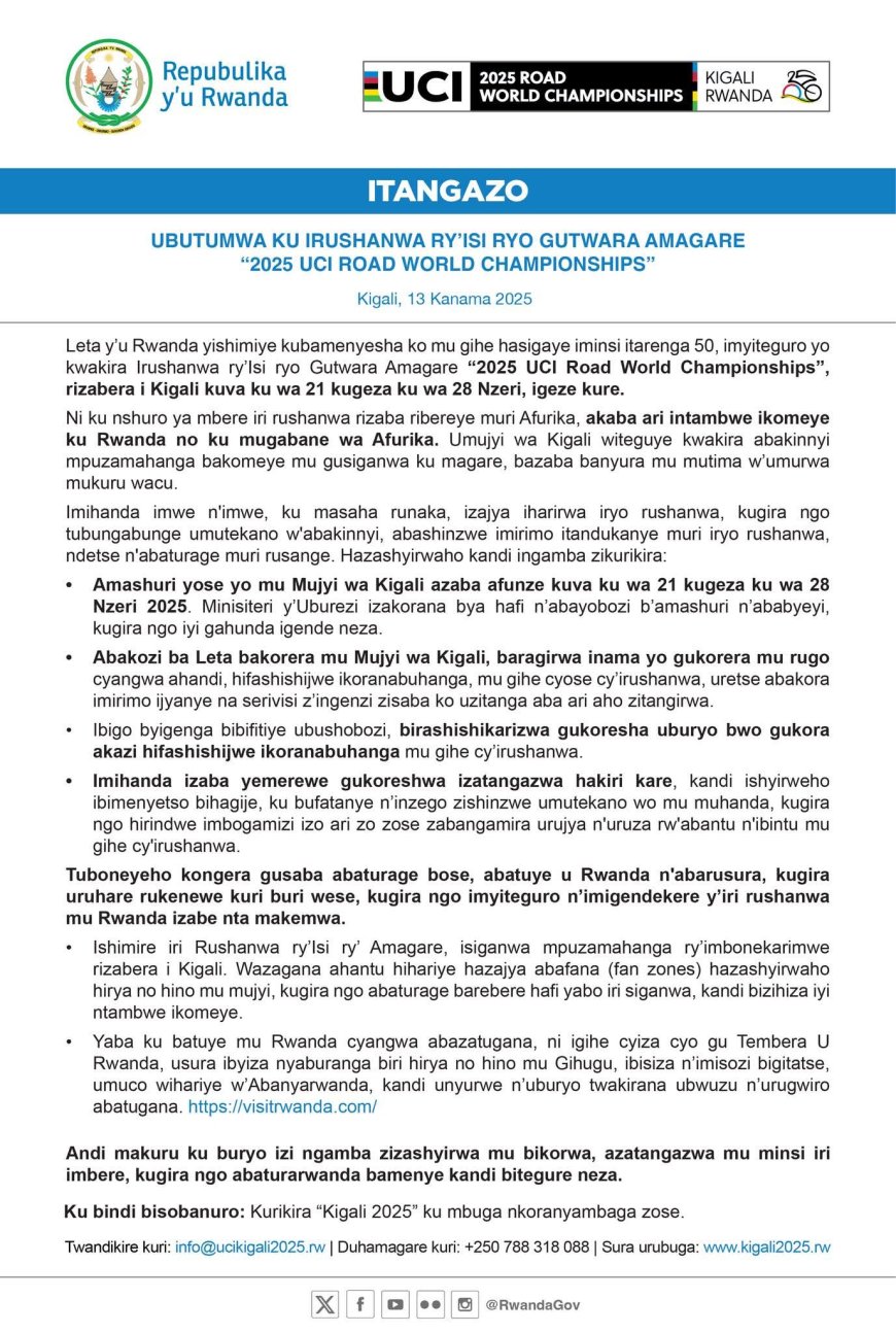 Ni irushanwa ry’amagare ryatangiye kwitegurwa na Leta y’u Rwanda, ndetse kuri uyu wa Gatatu tariki 13 Kanama 2025, yamenyesheje abanyarwanda by’umwihariko ababarizwa mu mujyi wa Kigali bimwe mu byo bazitaho kuko niho rizakinirwa cyane.