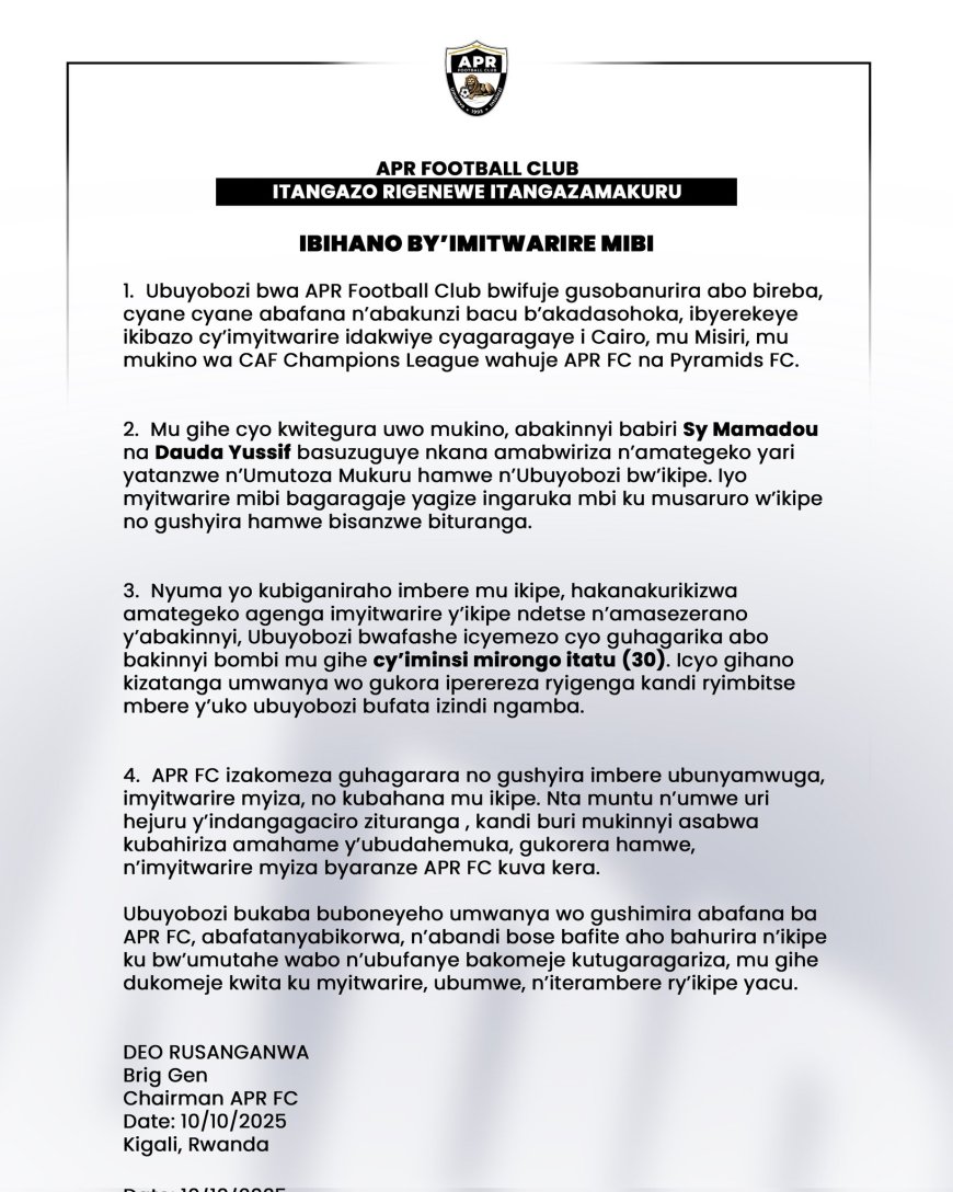 Mu gitondo cyo kuri uyu wa Gatanu tariki 10 Ukwakira 2025, nibwo Ubuyobozi bwa APR FC bwashyize hanze itangazo rimenyesha abakunzi bayo ko abakinnyi babiri, Mamadou Sy ndetse na Dauda Yusif Seidu, bahagaritse iminsi 30 mu gihe hari gukorwa iperereza ryimbitse kuri iyi myitwarire.