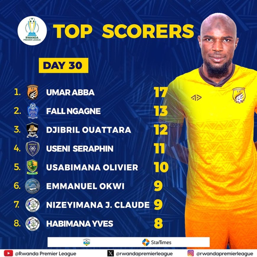 Abakurikiye Umar Abba kuri lisiti y’abatsinze ibitego byinshi barimo Fall Ngagne wa Rayon Sports uri inyuma n’ibitego bine ndetse na Djibril Ouattara wa APR FC