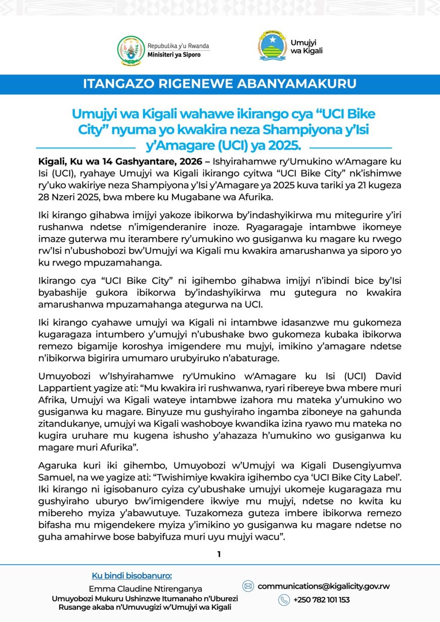 Umujyi wa Kigali wahawe ishimwe rikomeye n’Impuzamashyirahamwe y’Umukino w’Amagare ku Isi (UCI) nyuma yo kwakira neza Shampiyona y’Isi y’Amagare ya 2025.