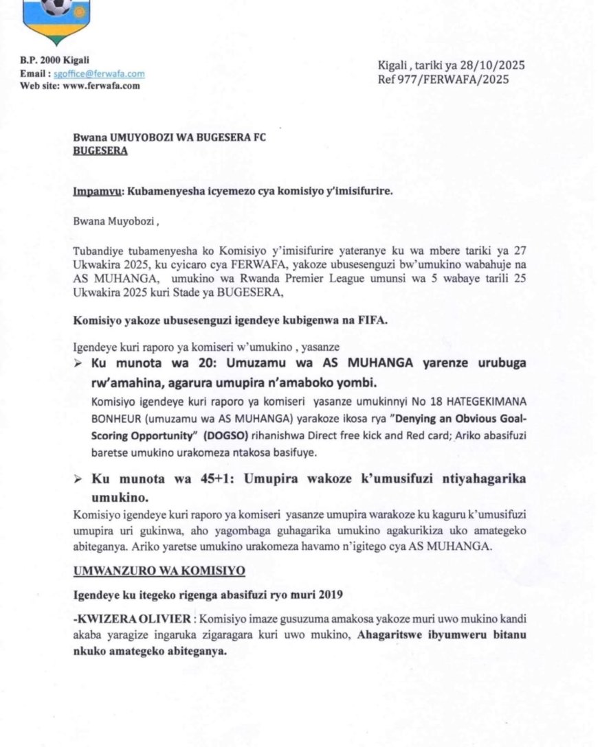 Mu ibaruwa FERWAFA yandikiye ubuyobozi bwa Bugesera FC isubiza ibaruwa banditse basaba ko barenganurwa, yabamenyesheje ko yahannye abasifuzi barimo Kwizera Olivier wari mu kibuga hagati ndetse na Mbonigena Seraphin wari umusifuzi wa mbere wo ku ruhande.
