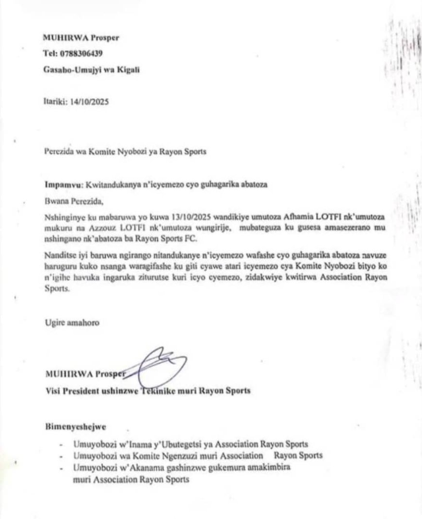 Ibi bikubiye mu ibaruwa ngufi Muhirwa Prosper yandikiye ubuyobozi bwa Rayon Sports, yemeza ko yitandukanyije n'icyemezo cyo guhagarika uwari umutoza Afhamia Lotfi ndetse n'umwungiriza we.