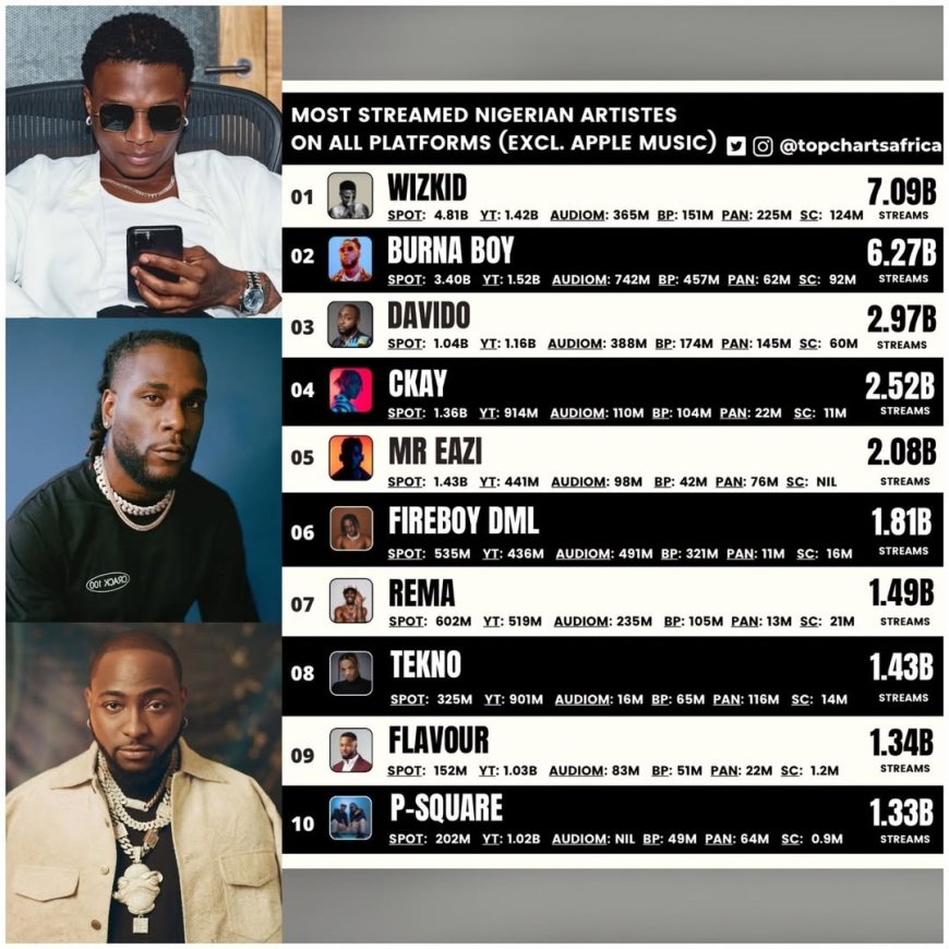 Kuri ubu Wizkid niwe muhanzi wo muri Afurika wujuje miliyali 10 z'abumvise indirimbo ze kuri Spotify. Ku ruhando mpuzamahanga Drake niwe wumviswe cyane mu 2025 kuri Apple Music.