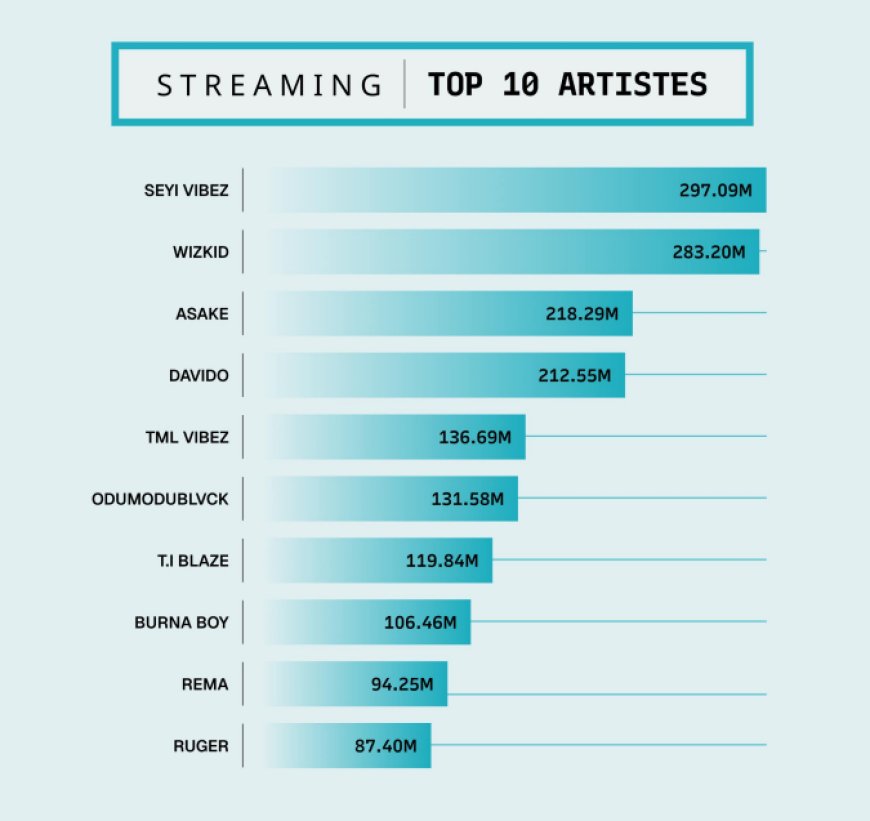 Seyi Vibez yumviswe na miliyoni 297 ku mbuga zose zicuruza imiziki. Uyu we abikesha EP yise’Children Of Africa’ iriho indirimbo enye. Album ya Davido yise 5IVE iri ku mwanya wa kabiri mu kumvwa cyane n’asabaga miliyoni 173 ariko indirimbo yakoranye na Omah Lay niyo yakunzwe cyane kuri uwo mushinga.