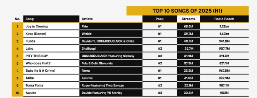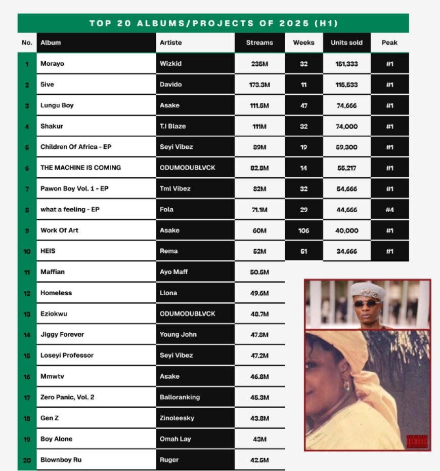 Umuhanzi w’umunyabigwi muri Nigeria, Wizkid yumviswe n’abasaga miliyoni 235 mu mezi atandatu ya mbere ya 2025.TurnTable, urubuga rucaho imiziki muri Nigeria rwerekana ko mu mezi atandatu ya mbere ya 2025 Wizkid ari we muhanzi wumviswe cyane n’abasaga miliyoni 235 abikesha album ya gatandatu yise Morayo.