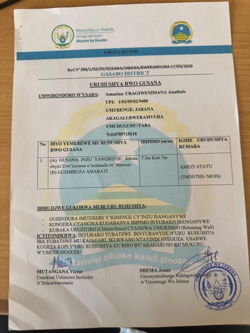 Uyu muntu yatse icyangombwa cyo kuvugurura inzu ishaje, ifite metero 7,5X7. Aragihabwa. Icyangombwa cyerekana ko yagombaga. Gusana inkuta ebyiri, urw'inyuma n'uruhande rw'ibumoso,gusimbuza amabati.